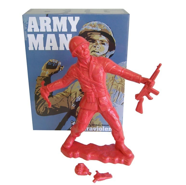 Do you wish to relive your childhood of playing with little green army men, but you don’t appreciate the ‘little’ aspect anymore? Then you need the Frank Kozik Big Army Man. A stunning 18 inches tall, this Red army man features interchangeable hands that include a grenade, Thompson machine gun, open hand, or a… rubber chicken. Huh?