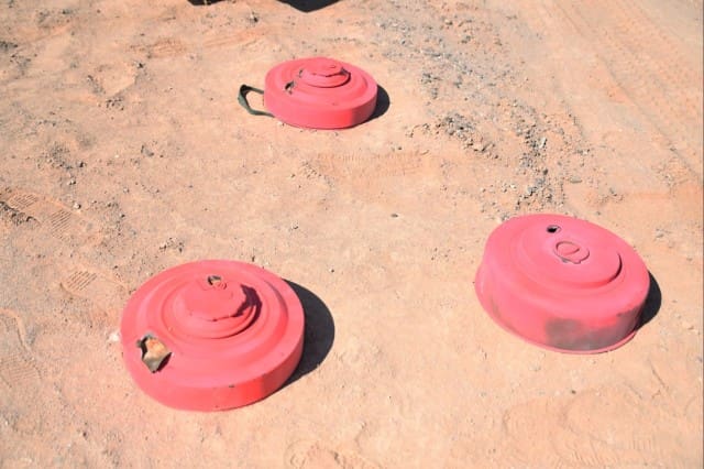 YTC provided a wide area laid out with six lanes of high explosive mines with inert fuzes comprised of both US M-15 and foreign TM-62M. The team placed the mines strategically atop a tarp to track how the mortar shrapnel hit each mine and the surrounding area.