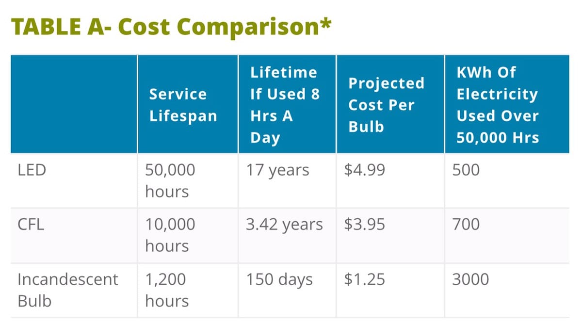 The real cost-benefit analysis of purchasing an LED bulb over its counterparts becomes clear around the 5-year mark (see Table B – 1 Ballast). At the 10-year mark, CFL bulbs cost two times the amount and incandescent bulbs are six times the amount of a single LED bulb.