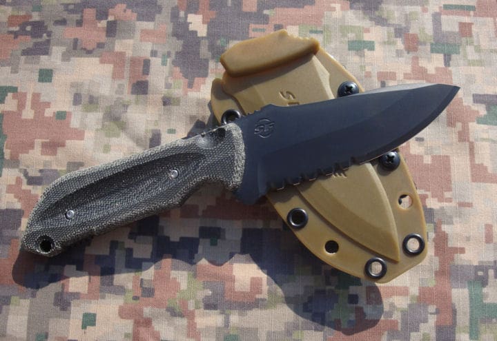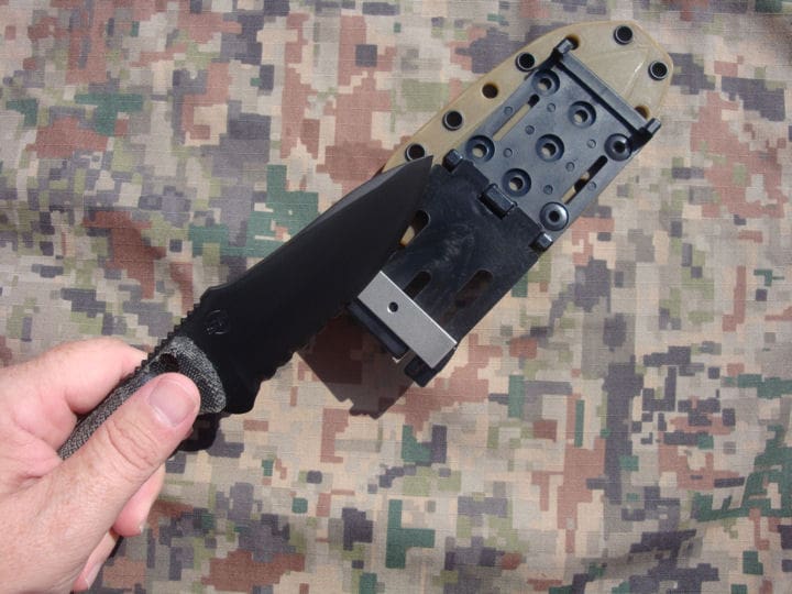 The Micartaâ„¢ handle was chosen for wet conditions and its ergonomic profile covers a cutaway steel frame to reduce weight. The injection-molded sheath has an edge reinforced with rivets which also facilitate numerous attaching options. It is form fitted to the blade and keeps the knife secure. Additionally, the DMT diamond sharpener is ingeniously hidden in the Tek-lok attachment.