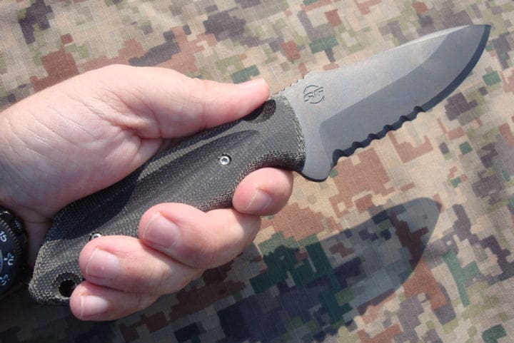 Designed specifically for use by Special Warfare personnel, the fixed blade Echo features a spear point crafted from CRUCIBLE CPM® 3V® carbon steel coated in a rustproof film. Envisioned by Knifesmith Steve Ryan, it is a straight forward design that is low on gadgetry and high on reliability. The inch and a half of the blade closest to the handle is serrated and the entire blade features an asymmetrical grind.
