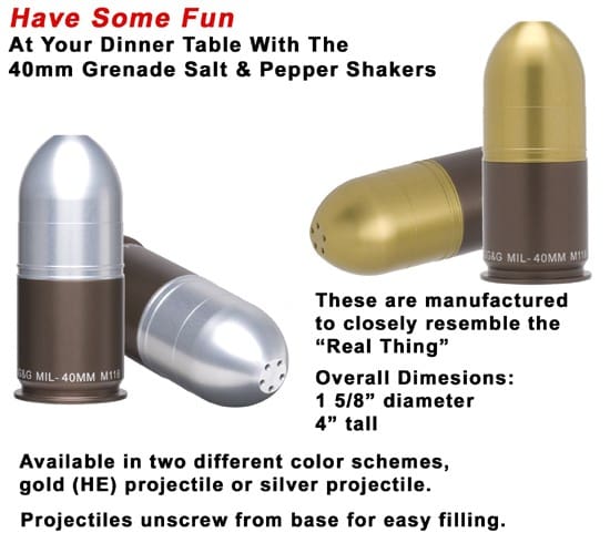 Manufactured to closely replicate the dimensions of actual 40mm grenades, GG&G’s salt and pepper shakers closely resemble the real thing. They are manufactured from solid billet 6061 T-6 aluminum. The projectiles unscrew from the base for easy refill, and the projectile tips are engraved with “P” and “S” for easy identification. Available in two different color schemes, sliver or gold, with overall dimensions of 1 5/8″ diameter and 4″ tall.