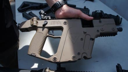 This is the Vector CRB Enhanced. The CRB is the semi-automatic civilian carbine variant of the Vector, chambered for .45 ACP. It comes with an M4 stock adapter, a Magpul UBR stock, and the enhanced square barrel shroud.