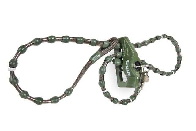 We ran into this item at the recent Multi Agency Craft Conference at Little Creek Naval Amphibious Base. The EZ Loop Lock from utilizes two steel cables connected by a series of steel lugs. Each locking lug is made of forged steel that is press on to the steel cable and coated in plastic to prevent scratching. The unique design allows the user to make up to 4 locking loops. This means you can lock up four individual items with one locking cable. Additionally, the 54″ cables can be connected using the loops on the end as girth hitches to extend their length as long as is required.