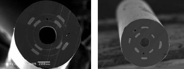 SEM micrographs of the resulting fiber cross-section, illustrating the uniform conservation of the cross-section structure from the macroscopic preform to the microscopic fiber.